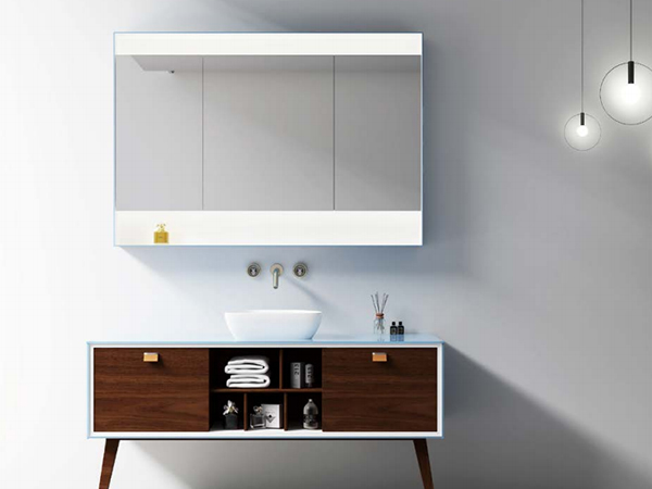 - 感應(yīng)鏡柜功能:金屬裝飾外框夢幻藍(lán)色,內(nèi)鏡柜為 PU 二分
